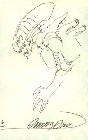 This was drawn by Mark Nelson in 1990, at Capitol City Comics in Madison, WI. I was damn excited to meet him, and he seemed to have some extra time on his hands, so I asked him to draw a "Large Alien". Notice the little man in the lower left corner..